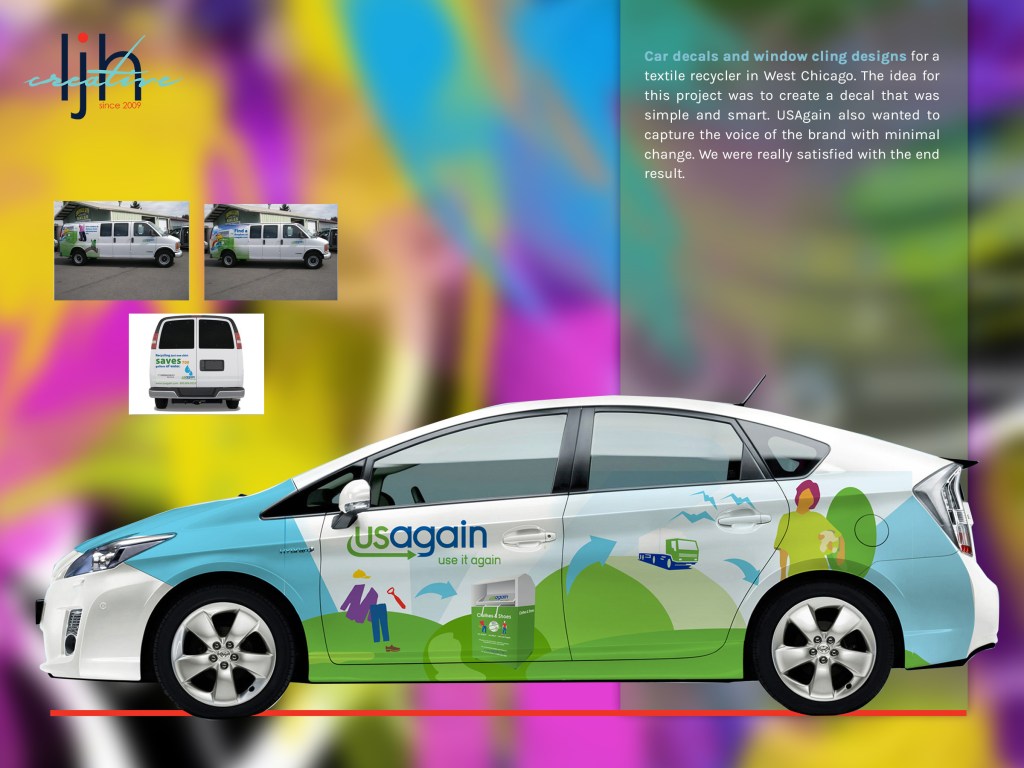 Car decals and window cling designs for a textile recycling company in West Chicago. The idea for this project was to create a decal that was simple and smart. USAgain also wanted to capture the voice of the brand with minimal change. We were really satisfied with the end result.